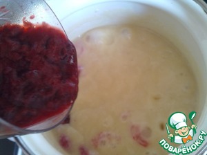 • Добавляем лимонный сок и свежевыжатый ежевичный сок. Варим при постоянном помешивании, пока температура смеси не достигнет 115 градусов. Если нет кухонного термометра, то, чтобы определить готовность сваренной смеси, в стакан с холодной водой нужно капнуть чуть готовой смеси, должен образоваться мягкий шарик, но не расплываться.