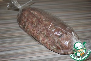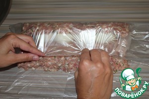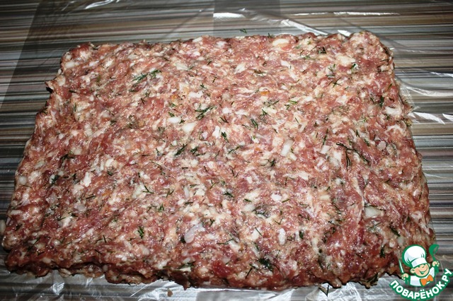 На столе расстилаю пищевую пленку. Выкладываю на нее фарш, разминаю его, придавая форму прямоугольника. Толщина должна быть 1,5-2 см.