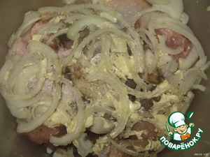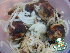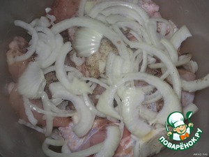 Нарезаем курицу кусочками, укладываем её в посуду слоями (мы используем пластиковые контейнеры). Каждый слой пересыпаем солью, перцем и нарезанным луком.