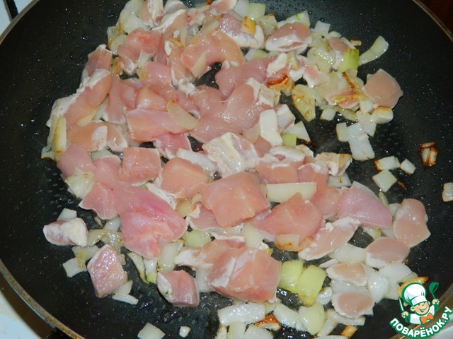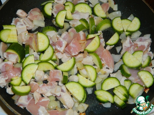 • Добавить нарезанные кабачки. Немного посолить, поперчить.
