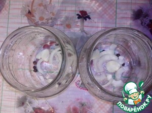 На дно банок выкладываем полукольца лука, дольки чеснока, перец душистый, лист лавровый