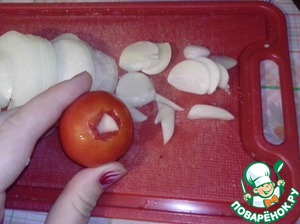 В каждой помидоре вырезаем "жопку" - слегка, и засовываем кусочек чеснока