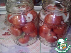 Укладываем в банки помидоры, посыпаем сверху лучком и накрываем крышками