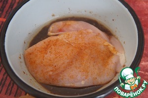 Положить мясо в маринад и хорошенько его искупать в нем. Оставить курицу в маринаде на 20 минут.