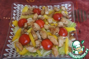 Разложить половинки помидорчиков, перец, нарезанный продолговатыми ломтиками и остывшие кусочки курицы.