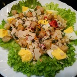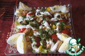 Полить салат заправкой, посыпать зеленью и зеленым луком, украсить дольками крутого яйца.