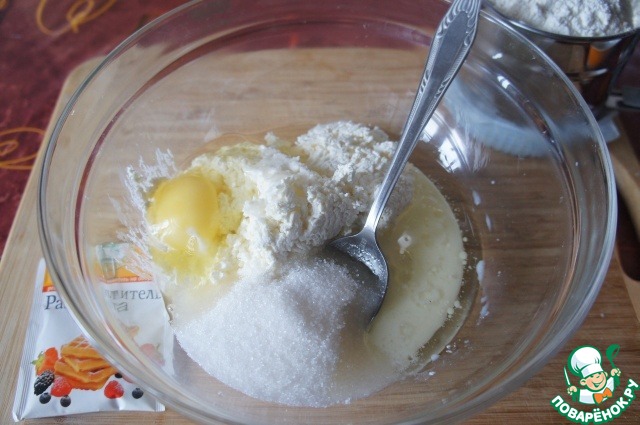 • Творог протереть через сито, если требуется, смешать с солью, молоком, сахаром, растительным маслом и яйцом.