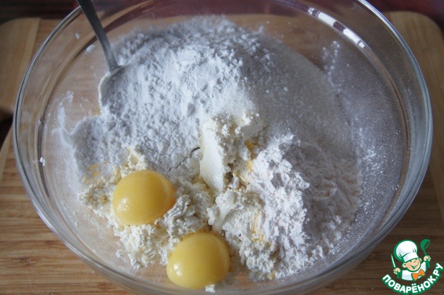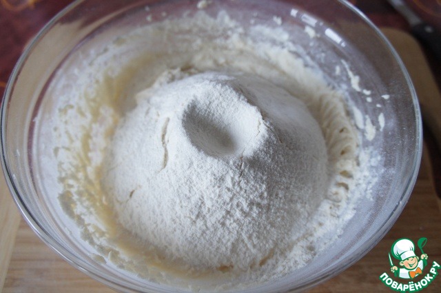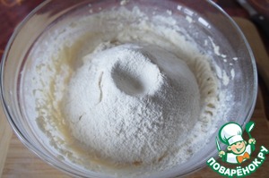 • Очень тщательно вымешать. Муку смешать с разрыхлителем. Просеять половину смеси в творожную массу и хорошо перемешать.