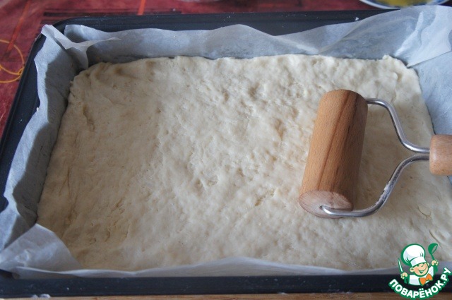 • Большой, глубокий, прямоугольный противень (у меня 22,5х33,5х5 по внутренним граням) застелить бумагой для выпечки и смазать маслом.