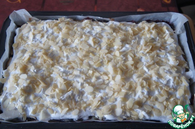 • Белки взбить, тонкой струйкой всыпать оставшиеся 100 г сахара и еще взбить до крепких пиков. Вынуть пирог из духовки, равномерно разложить взбитую массу,