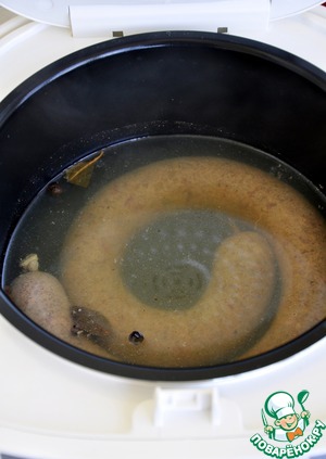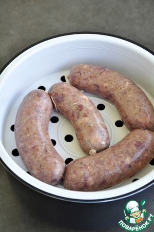 Воду в чаше посолить, добавить лавровый лист, душистый перец, кориандр, выложить в нее колбасу и готовить в режиме "Варка на пару" 12-15 минут. Колбасу нужно несколько раз проколоть иголкой чтобы черева не лопнули во время приготовления. Вода в этом режиме не кипит а еле-еле булькает, что очень важно при приготовлении колбасы. -