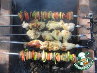 У меня стояло ночь и пол дня. Но это совсем не обязательно. Жарим на углях. У нас это было вместе с курицей. |