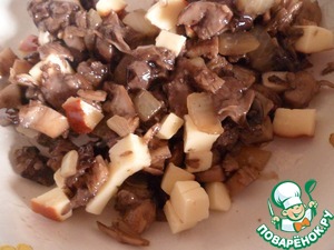 Соединить грибную поджарку с порезанным кубиками копченым сыром.