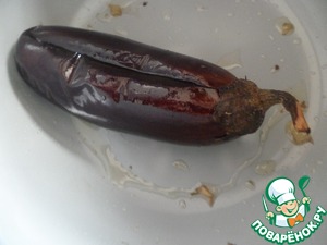 Баклажан вымыть, сделать продольный надрез, смазать растительным маслом и посыпать солью. Включить мультиварку в режиме "Запекание" на 40 минут. Положить баклажан в чашу и готовить при закрытой крышке.
