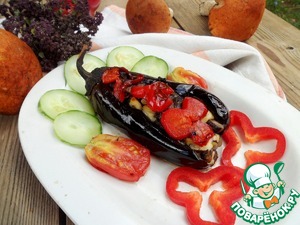 Достаем испеченный баклажан, в разрез кладем начинку, сверху укладываем кружочки болгарского перца, по бокам половинки помидора и запекаем еще 25-30 минут.