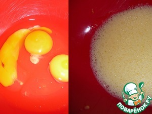 Муку добавить в масляно-яичную смесь и продолжать взбивать.
