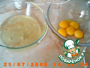 • Взбиваем белки вначале в крепкую пену, после постепенно по чайной ложке, взбивая, всыпать полстакана сахарного песка.