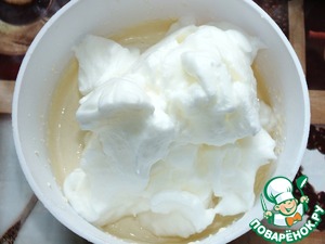 В желтковую массу аккуратно лопаткой вмешиваем белки. Должно получиться воздушное тесто
