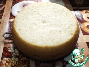 Остывший бисквит разрезаем на 3 части. Для любителей мокрых тортов можно пропитать коржи. Я сделала пропитку из какао (на 1 стакан воды - 2 ч. л. детского какао и сахар по вкусу). После того, как корж пропитан, наносим слой карамельного соуса