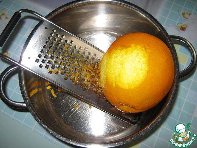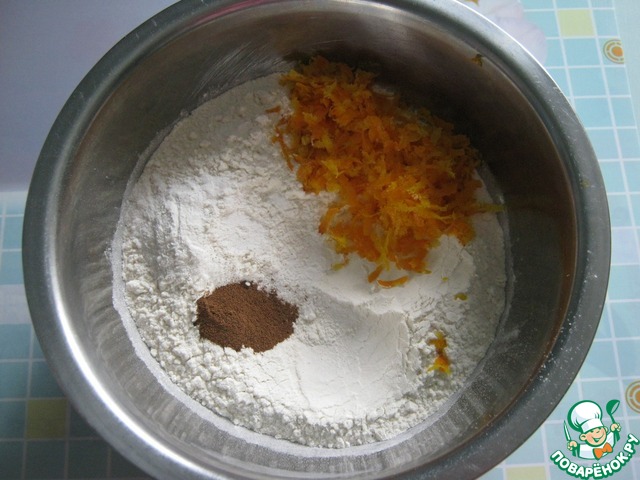 Добавляем в муку цедру апельсина, разрыхлитель, корицу, всё перемешиваем.