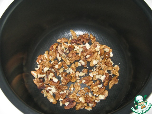Включаем мультиварку на режим "Выпечка" и кладём туда орехи. Пока мы будет замешивать тесто, они успеют поджариться, выделив достаточное количество эфирных масел.
