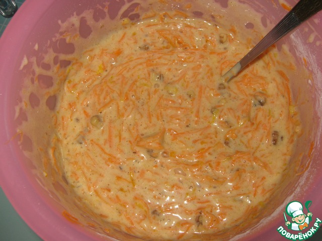 Смешиваем жидкую и сухую смеси, добавляем морковь и орехи.