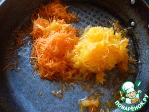 Делаем зажарку. Морковь и тыкву натираем на мелкой терке.