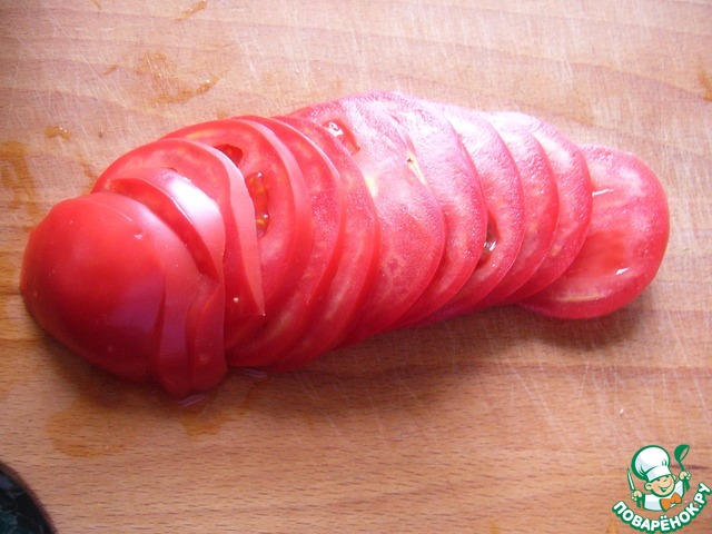 Помидор нарезать тоненькими кружочками, отставить в сторону, чтобы из него вышёл лишний сок