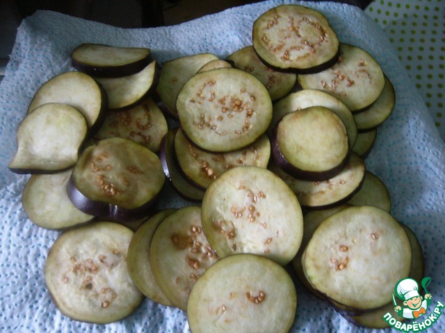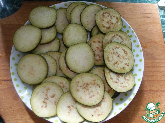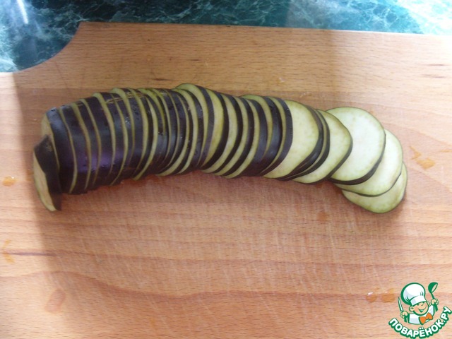 Пока рис варится-баклажан помыть, нарезать тоненькими кружочками (2-3мм)