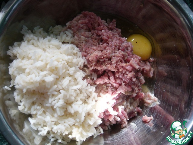 Приготовить фарш. Пропустить через мясорубку мясо, лук, батон, замоченный в молоке и слегка отжатый (это молоко в конце добавьте в фарш). Добавить рис, яйцо, соль и специи по желанию и вкусу-всё хорошо перемешать