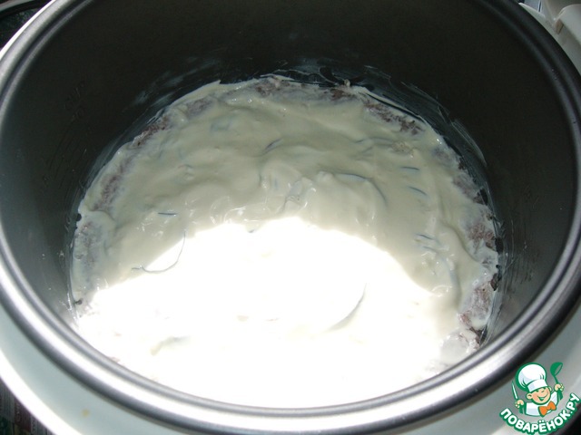 Приготовить соус-смешать майонез, сметану, чеснок, выдавленный через чеснокодавилку