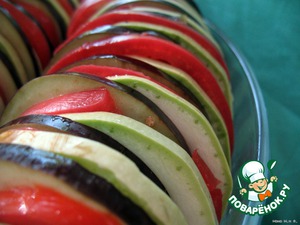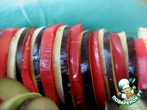 Овощи нарезать тонкими кружками (на Бернере), кружочки баклажана посыпать солью для удаления горечи и лучшей пропекаемости, подождать 10 минут и промокнуть салфеткой или немного отжать. Овощи разложить зеброй
