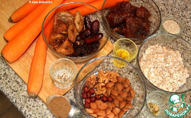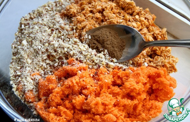 Собираем все ингредиенты для нашего теста: основа из овсянки и морковного сока, жмых от моркови, масло льняное, измельченные орехи, порезанные сухофрукты, корицу.