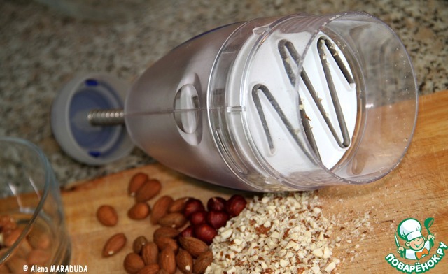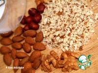 Измельчаем орехи: миндаль, фундук, грецкий орех. А также измельчаем отдельно ядра абрикосовых косточек для крема.