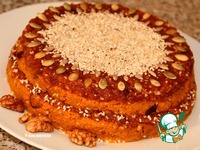 Для этого украшаем наш торт, выкладывая сначала семена тыквы по максимальному диаметру, затем - семена подсолнечника. Центральную часть посыпаем кунжутом. Ставим готовый торт для охлаждения в морозилку на два часа.