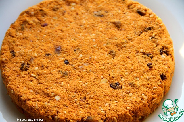 Выкладываем получившуюся лепешку на центр тарелки и формируем плотно первый слой из коржа нашего торта диаметром 19,0 см.