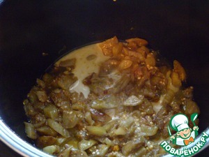 Первые 10 минут периодически помешиваем, затем вливаем мясной бульон. У меня была мясная подлива с морковью.