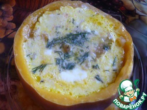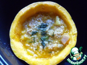 • На дно чаши наливаем 0.5 стакана воды, ставим тыкву, фаршируем ее тушеной картошкой, добавляем укроп.