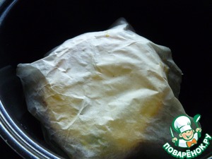• Крышечка у меня не поместилась, иначе крышка мультиварки не закрывалась. Тогда я взяла пергамент и накрыла им сверху тыкву.