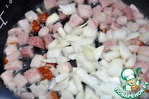 Мультиварку включаем на режим "Тушение", обжариваем бекон до вытапливания жира. Добавляем нарезанный лук и обжариваем до прозрачности.