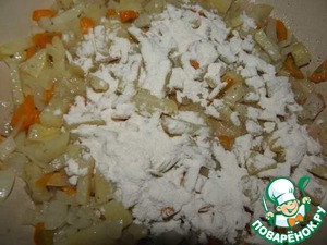 Разогреть сковороду, добавить растительного и сливочного масла, выложить овощи и немного обжарить, чуть посолить и поперчить. В конце добавить 1ст. л муки, немного помешать и выключить