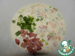 После этого влить в суп сливки ( у меня 350гр, 20-22% ), добавить специи по своему вкусу и варить 5-8минут, в конце положить креветки и варить еще 3минуты. Бекон мелко порезать, обжарить на сковороде до корочки, и добавить в тарелку к супу. Зеленый лук тоже порезать и посыпать блюдо. Приятного аппетита!
