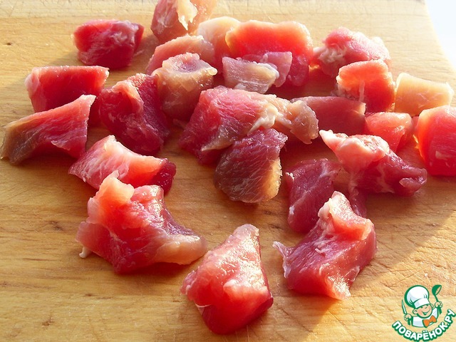 Для придания колбасе характерного ветчинного вкуса, мясо следует предварительно засолить. Мякоть свинины (1300 г ) режем на куски, засыпаем соль (24 г), глюкозу (2 г) и перемешиваем. Для того, чтобы мякоть колбасы имела аппетитный бардово-красный цвет, используем нитритную соль. Можно использовать и обычную поваренную соль, но в этом случае мякоть колбасы будет иметь сероватый цвет (обычный для варёного мяса цвет, как у буженины). Пряности на этом этапе не кладём. Укладываем мясо в подходящую посуду и отправляем в холодильник на трое суток. Желательно, чтобы температура, при которой находится мясо, не превышала 3 град Ц. Один раз в день перемешиваем мясо.