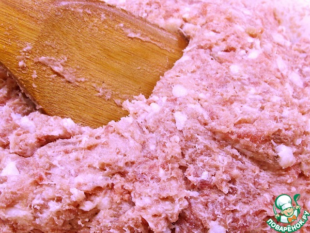 Добавляем специи в фарш и тщательно вымешиваем его. Выбиваем фарш до тех пор, пока он не начнёт тянуться за ложкой, а на стенках миски не появится характерный белый налёт.