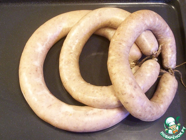 Режем свиную череву на кусочки длиной 50 см и набиваем её фаршем. Набиваем довольно плотно. Удобно использовать для этого насадку для изготовления колбасы - приставку к мясорубке. Завязываем крепко концы черевы колбасной бечевкой и сворачиваем колбасу в колечко. У меня получилось три кольца. Отправляем колбасу на сутки в холодильник. За это время колбаса впитает аромат специй и уплотнится. Вообще-то колбасу нужно подвесить, но у меня она просто лежала на доске.