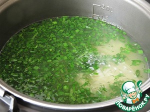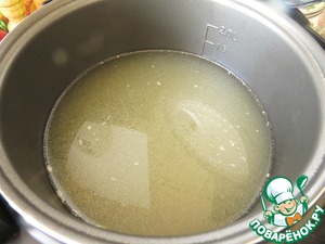 Наливаем бульон в чашу мультиварки. Не расстраивайтесь если бульона нет, можно налить просто воды и добавить в неё 1-1,5ст. л растительного масла, соль и перец по вкусу. Включаем программу "суп".