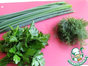 - Зелень (1 пуч. петрушки, 1 пуч. укропа, 1 пуч. зелёного лука) — 3 пуч.