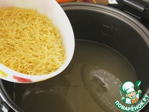 Как только бульон закипел (примерно минут 7-10), всыпаем макаронные изделия, можно взять любые любимые макарошки, нам нравится вот такая мелкая вермишелька.