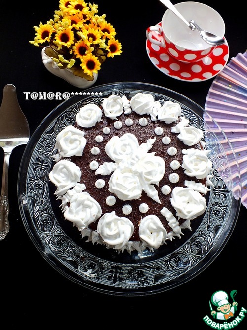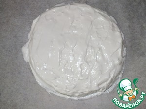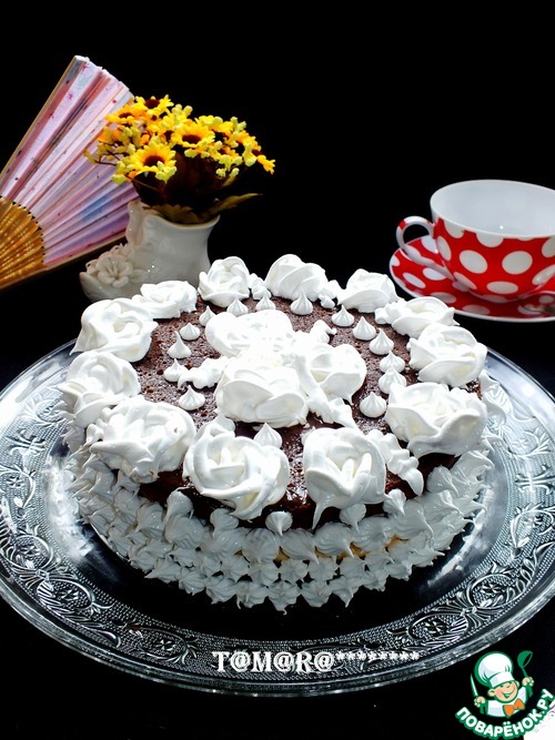 Торт можно украсить по вашему усмотрению, я сделала белковый крем: на паровой бане взбила 3 белка и 150 гр сахара до пиков. С помощью кондитерского мешка сделала украшение.