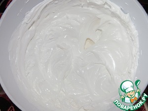 Пока печется бисквит нужно испечь прослойку из безе. Для этого 3 яичных белка взбить взбиваем миксером до пены, подсыпаем 120 гр сахара. Продолжаем взбивать в течение 10 минут до крепких пиков.